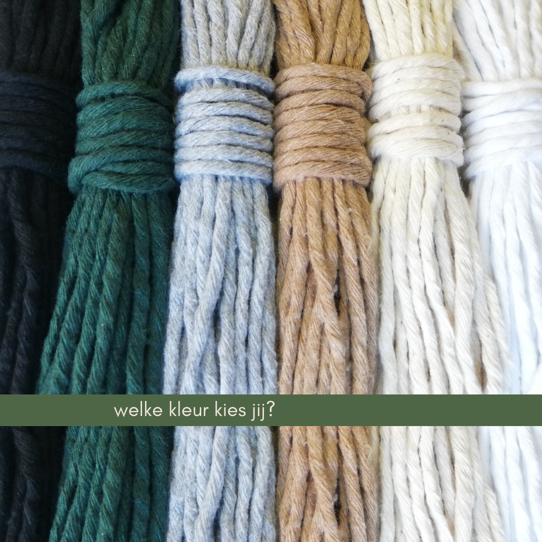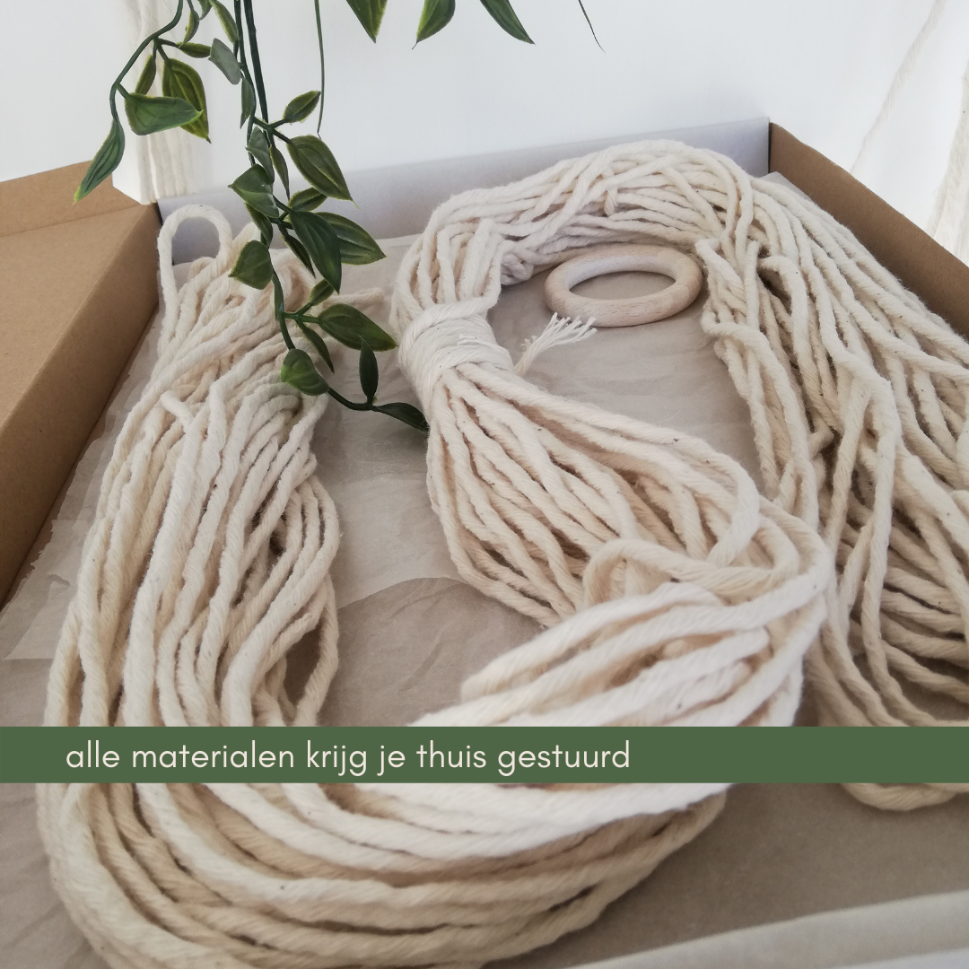 - In het pakket dat je thuisgestuurd krijgt, zit materiaal voor twee hangers. Het draad is gemaakt van 100% gerecycled katoen. Je krijgt het aantal meters dat je gebruikt en blijft dus niet zitten met de rest van een 120 meter klos.