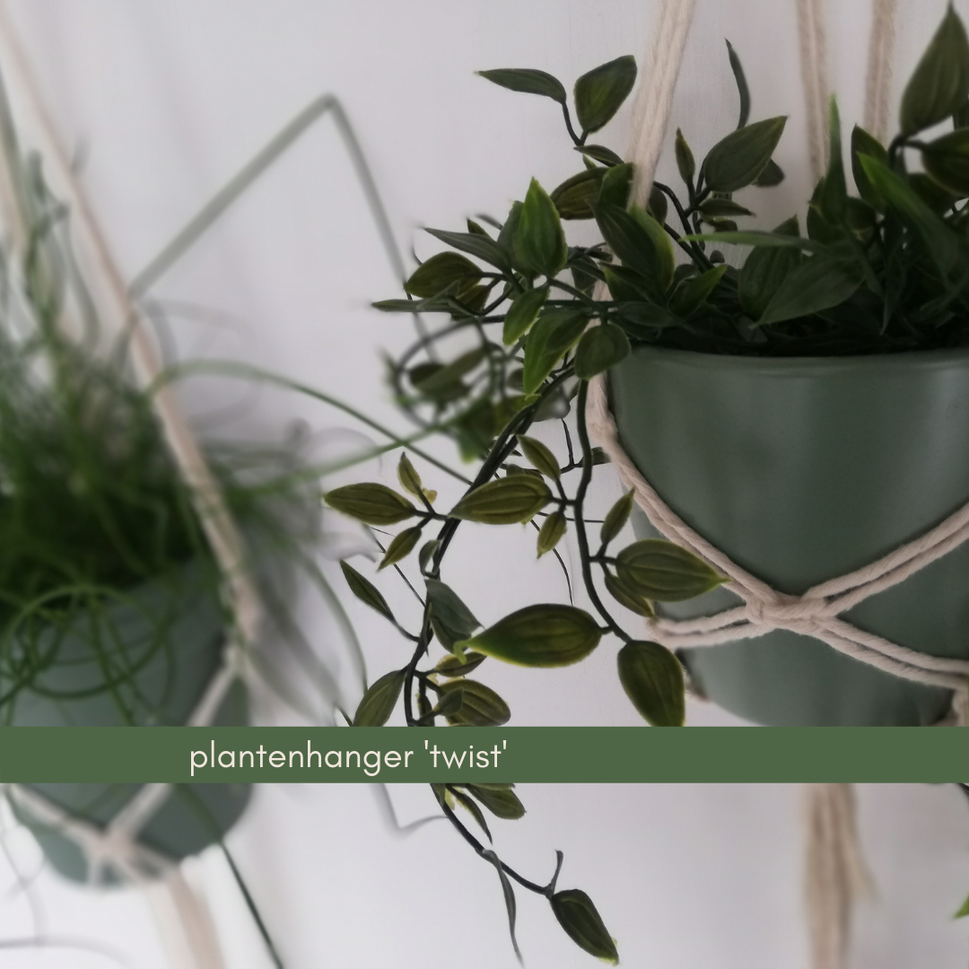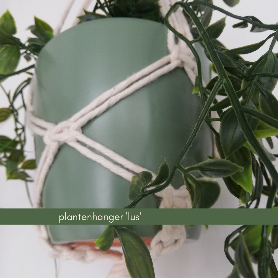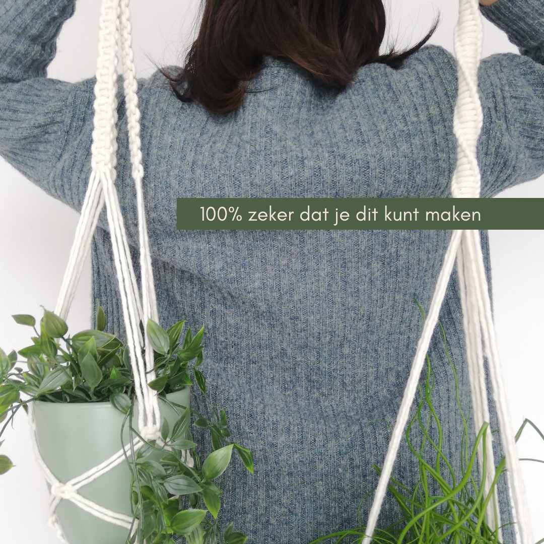 - Je knoopt twee verschillende modellen plantenhangers. En om het nog makkelijker te maken, krijg je tijdelijk een handige deurhaak kado. Hier hang je de draden aan op en dat werkt super fijn.